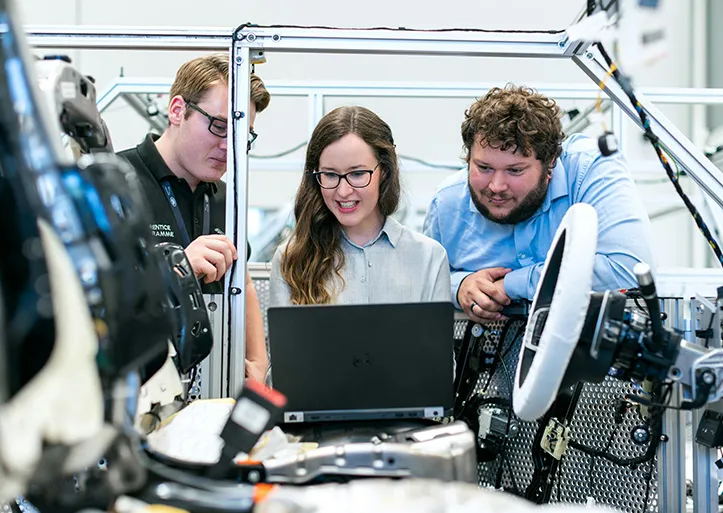 Three people, two men and one woman, working together on a laptop among car components in a laboratory setting.