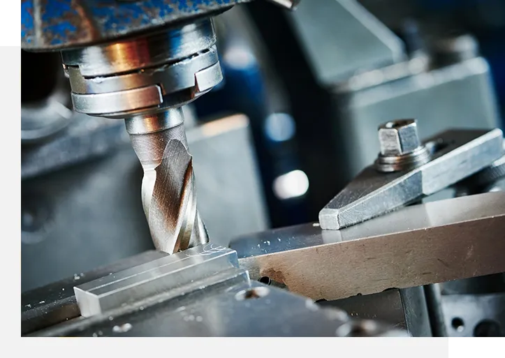 Close-up view of a metalworking drill bit machining a piece of metal in a workshop setting.