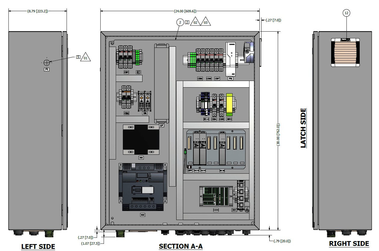 Diagram of an industrial electrical control panel showing the front view (Section A-A) with detailed internal components, and simplified left and right side views with dimensions.