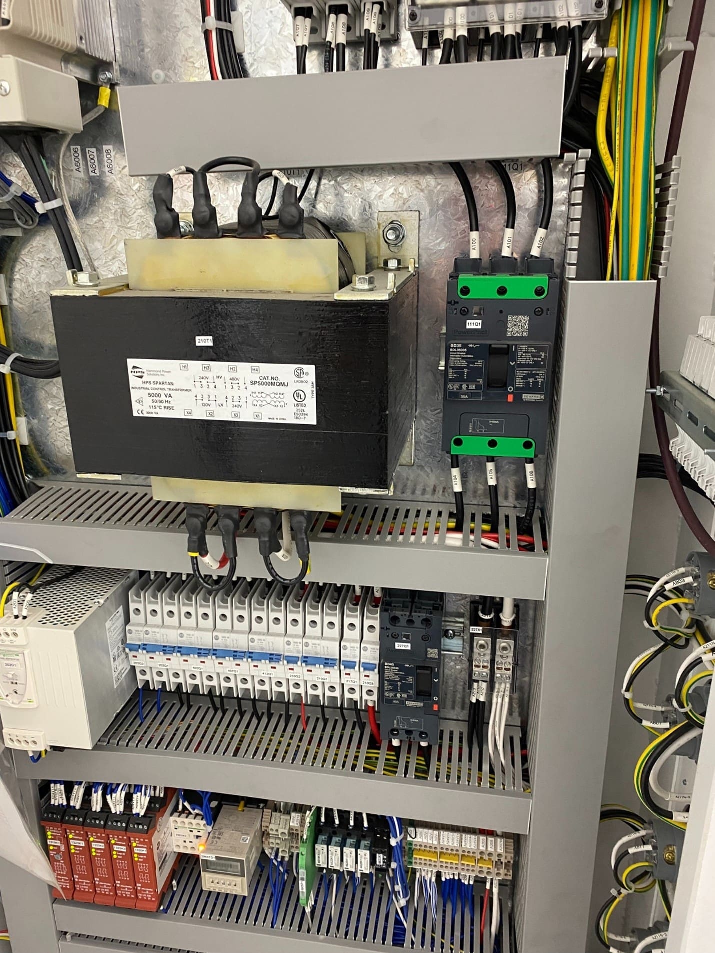 A view of an electrical panel with various circuits, wiring, and components, including a transformer and circuit breakers.